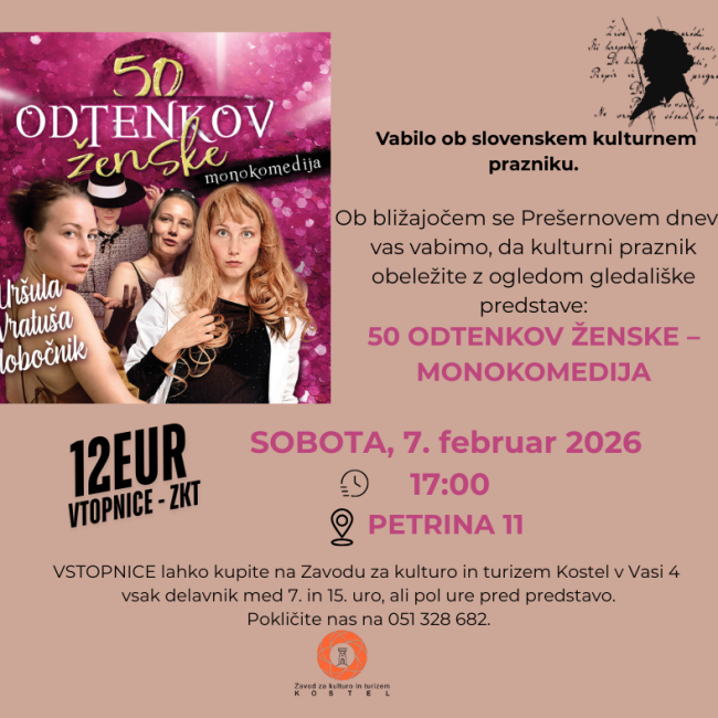 Ob bližajočem se Prešernovem dnevu vas vabimo, da kulturni praznik obeležite z ogledom gledališke predstave: 50 odtenkov ženske –